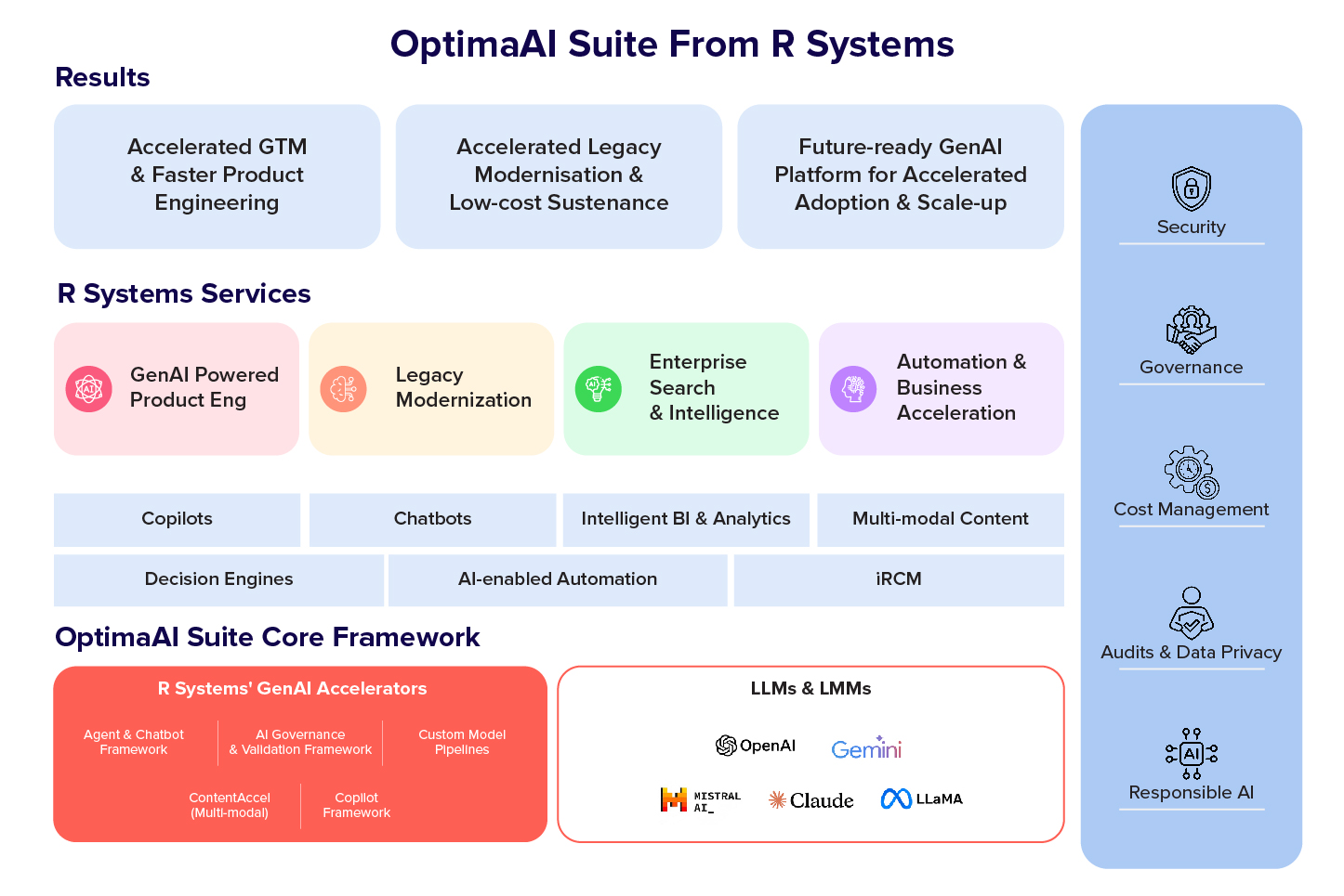 At R Systems, we leverage the power of Generative AI to revolutionize digital product engineering. Our GenAI platform, OptimaAI suite, is designed to unlock revenue growth, operational efficiencies, and faster innovation for businesses. Our integrated and technology-agnostic team of AI experts and practitioners helps customers adopt GenAI solutions, ensuring they stay ahead in this technological disruption.